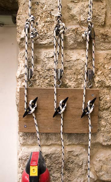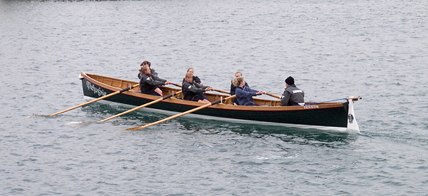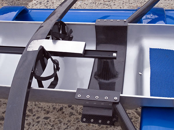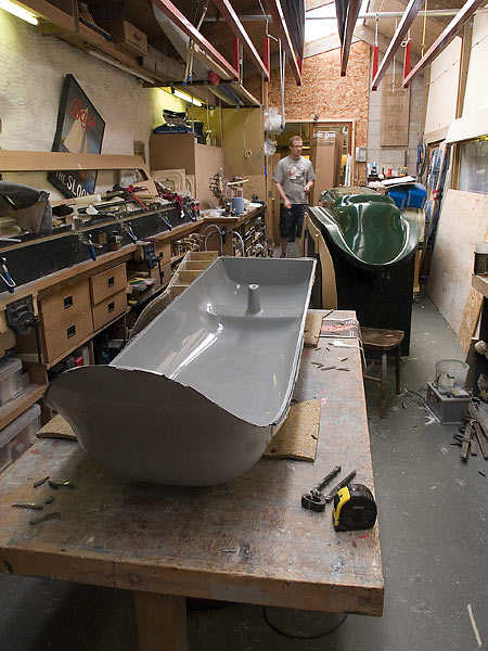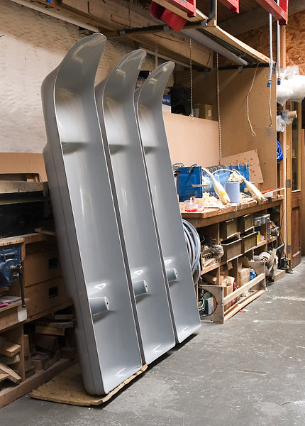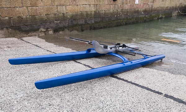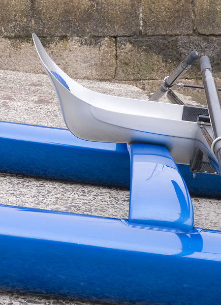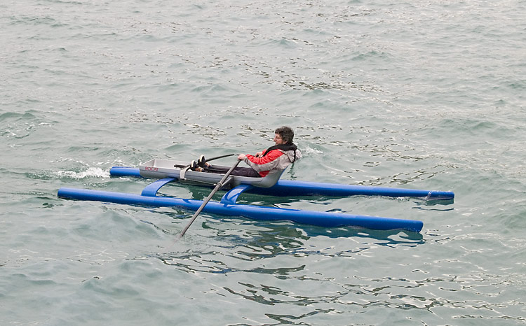 21 May 2006 The seatdeck moulding cycle has gone very smoothly, and we have three seatdecks trimmed and ready for paint. Jake Frith came down from Southampton yesterday to try the boat. Jake, who is an experienced coastal sculler, has been following the ROCAT's progress since he saw the boat on the 'Concept Boat' stand at the 2003 London Boat Show. Hearing that we planned to take the ROCAT over to the 'British Coastal Challenge' in Guernsey in September, he tentatively volunteered to row it for us. Fortunately for the trial, the rain had passed over and the sun shone. There was a brisk 30mph breeze however, but it was offshore so he didn't get to experience how the boat handles a big sea. When he came in he told me that he liked the boat, but didn't think that it would do very well in Guernsey the way it is I can't deny that this came as quite a blow. With Anthony's help, I believe I have produced the only fast rowing boat that can be safely, and enjoyably, rowed on a very rough sea is it very greedy of me to want it to be able to beat other open-water boats on speed too? Richard (boat #2) has cautioned me to moderate my expectations, speedwise, but I reason thus: So far as I could work out when I designed the hulls in the first place, the ROCAT has a little more (perhaps 3-5%) 'wetted surface drag' than a sculling boat; but its extremely slim hulls have practically no 'wave-making drag', and the hullform is very clean and hydrodynamically sound. On top of that, the rig is more powerful because you have a solid back to push against, you can exert more force on the footbar which is transmitted directly to the oar, (which can be easily demonstrated with a leg press in a gym, or a recumbent bicycle). So with the overall hydrodynamic drag being similar, perhaps a little more, but the rig being more powerful, it seems reasonable to suppose that there would not be a lot of difference in speed. A number of things that Jake suggested derive from a sculler's mindset, and were either not possible or, because they would require new main moulds, not practical on grounds of cost. However, his first observation that the rig is too high geared does ring true, and is easy to remedy. There are any number of rigging charts for sculls, but none for a ROCAT rig, which is quite different. It's going to be higher geared than a conventional rig because you can push harder with your back supported (just as a more powerful engine can pull a higher gear in a car), but how much higher? it would appear that I have gone too far. We will set up one of the new Dreher oars with less outboard (inboard is fixed) and see if it's better. Although ROCATs racing ROCATs will happen in due course when there are enough to make a race, it would be good if ROCATs could also be competitive with the best open-water boats around. The trouble is, the races in which it would leave the competition standing, when it's blowing force 5 or 6, will be cancelled as unsafe for monohulls! ... CL ... 1) three seatdecks; 2&3) the coastal sculler tries the ROCAT in a stiff breeze. |