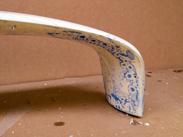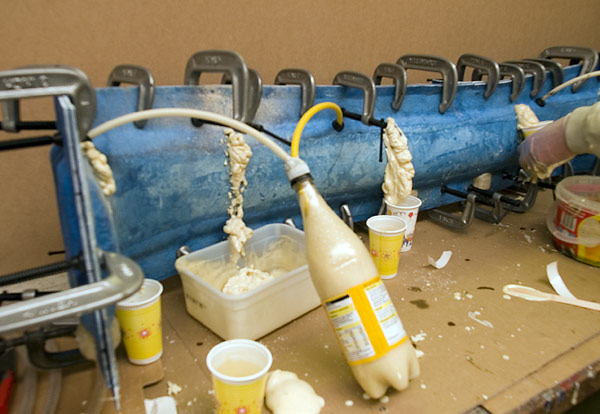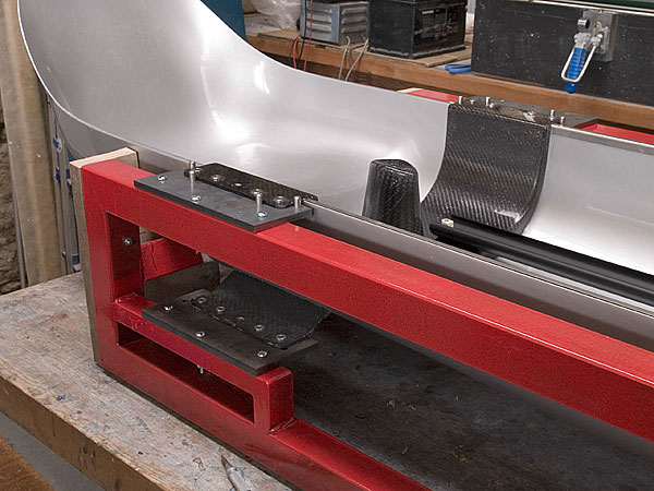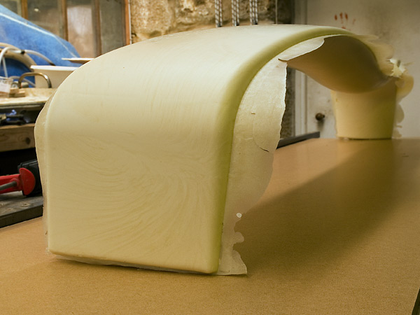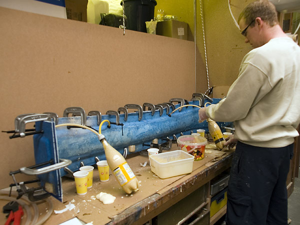 12 May 2006 A lot of the visitors to this website come to read about the technology we use in producing the ROCAT so, for this post, I crave the indulgence of the rowers while I go through the production of a seatdeck. Because we are not using gelcoat, we have found that spraying epoxy primer into the mould works well, and we can spray it on to the Frecote 770 semi-permanent release agent without problems. We use Saercore glass to reinforce the seatdeck, with some additional carbon around the back of the seat. Saercore (which is similar Rovicore) comprises random strands of glass either side of a 'resin infusion medium'. It's an excellent product which is largely responsible for the seatdeck being the easiest, and most reliable mould. We use a preform tool (a rough copy of the mould) to shape the Saercore, which is extremely good at conforming to quite complex double curvature shapes. The seatdeck mould is a 'matched mould' which has a 2.5mm cavity between the top and bottom mould surfaces. Once the layup is complete, the top is eased on and the vacuum clamp applied to hold it all very tightly together. The epoxy resin is mixed and degassed to remove the air that is introduced during the mixing process. For this mould we use a 40% vacuum in the mould cavity to draw the resin into the dry reinforcement. Due to the complexity of the shape, we use two vac ports; these have catch pots to eliminate the risk of resin being pulled into the vacuum pump. When we have resin showing at both the vac ports, we clamp off the resin feed; back off the cavity vacuum; take the vac port tubes out of the catch pots and 'head' them raise them up with resin in to ensure no air gets into the part. The seatdeck is then left to cure overnight. We are coming to the conclusion that, with the present space and limited staff, it makes most sense to produce the boats in batches of three. So we have made the seatdecks for boats 1 and 2, and will produce 3's next Monday. A number of people who have tried the ROCAT have observed a tendency to slip down in the seat I am slightly bemused by the fact that I never feel that, but it was something we had to tackle. So we set up proto 4's seatdeck in the workshop to get Anthony to identify what's happening so we can devise a remedy. We also used the opportunity to test the strength of the rowlocks under a static load (which is far more than one can apply with oars). The rowlocks checked out fine, and we found that some additional padding at the front of the seat seems to cure the slipping down problem. We also chopped up proto 3's seatdeck in order to establish if the rake of the seat back was the cause very fortunately, Anthony decided that the present rake is good. proto 4 is back in action, and I aim to do another longish row this weekend ... CL ... 1 & 2) laying up the seatdeck with carbon and Saercore; 3) infusing the resin we tint it to make it easier to see in the translucent plastic tube; 4) the resin showing to indicate that the cavity is full; the catchpot is on the right; 5) 'we have a good part' we are still so new to this that it's great when it happens! 6) testing the seatdeck and rowlocks in the workshop 7 May 2006 The web hosting move went remarkably smoothly, much to everybody's relief I have heard tales of domains getting lost in cyberspace for days. So far, then, I'm well pleased with 'clook.net' their customer service/support seems excellent. We have just taken delivery of the 'stiff' oar shafts from Dreher and what a difference! They look and feel really good, and I reckon we need have no further concerns about breakages with them. They are quite oval in cross section, with additional unidirectional carbon on the leading and trailing edges, where it's needed. We also ordered a pair of their rounded 'Apex R' blades to evaluate they look quite strange, but are beautifully made (as we've come to expect from Dreher), and we are looking forward to trying them. I have been asked how we make the foam polyurethane blanks which we use in all our carbon fibre parts I described it ages ago, so it's in the archive, but I thought I'd just recap. The normal way to make shapes with PU foam is to mix the two components, pour the mixture into a mould, and close the lid. We tried that, but the quality of the foam was awful. Then, quite by accident, we discovered that the quality of the foam is greatly improved if it foams outside the mould, and is forced into the mould through small pipes. It's very low-tech, but produces clean foam of very even consistency. Interestingly, the foam that erupts from the vents is even better quality, but we can't work out how to achieve that nor can we get a good explanation of why that's the case. I love strange phenomena! Anthony had cast a crossbeam blank, and it was sitting on the hull mould when he resprayed the hulls. When he'd finished, he noticed that the overspray had settled on the crossbeam blank in the most extraordinary patterns. Must be static, but why on earth did the dust settle in those shapes? ... CL ... 1) preparing the crossbeam foam mould; 2) after it's foamed: 3-5) the stage patterns on a crossbeam foam blank after Anthony resprayed the hulls; 6) after some work in Photoshop, this one could hang in a gallery! 5 May 2006 The ROCAT website is moving from 'NetPivotal' to 'clook' I hope the transfer will be smooth! ... CL 30 April 2006 As regular visitors will know, we make all the carbon fibre components inside closed moulds, using a core of cast polyurethane foam. We were so pleased when we managed to find a low-tech, but very effective way of making these foam blanks and, with practice, Anthony is producing good foam. But the other day, we noticed that a bubble was appearing on the surface of David's footbar after it had been heated for post-curing. We eventually worked out that, although the foam looked good on the outside, it contained pockets of air one of these had expanded with the heat, and distorted the softened ep